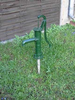 1.) Handpumpe für die Gartenversorgung, zum Befüllen von Fässern und Regentonnen und für die Gießkanne