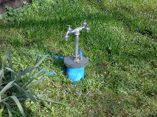 3.) Hauswasserpumpe selbstansaugend mit montierten Zapfstellen als einfache elektrische Wasserversorgung für den Hausgarten. Die Pumpe muß für die Wasserentnahme für die Wasserentnahme eingeschaltet und nach erfolgter Wasserentnahme wieder ausgeschaltet werden.
